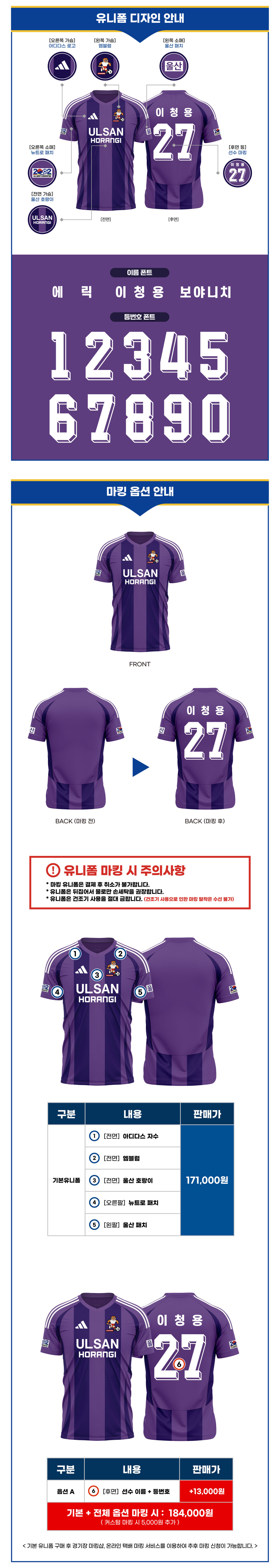 *기본마킹 유니폼을 구매 후, 마킹샵, 택배 마킹 서비스 등을 이용하여 추후 (선수, 패치)마킹 신청이 가능합니다.